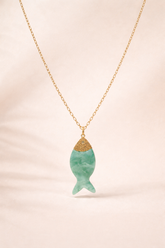 Collar largo dorado con colgante de pez en nácar verde agua | Edición exclusiva