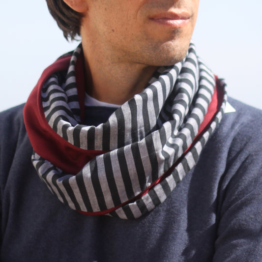 Bufanda Cuello Hombre · Rayas Negro Gris, Revés Burdeos