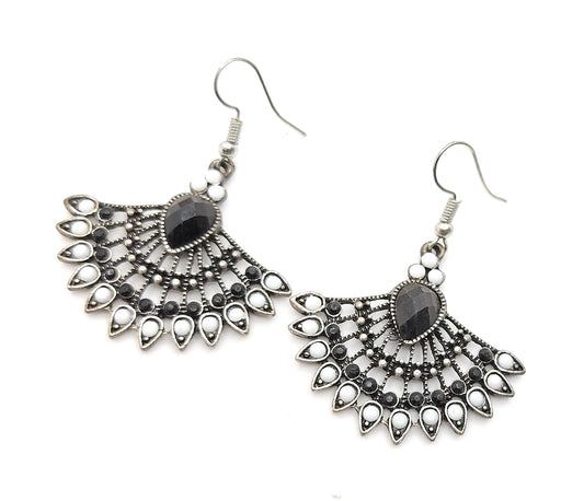 Pendientes Largos · Abanico Plata Cristales Blanco Negro