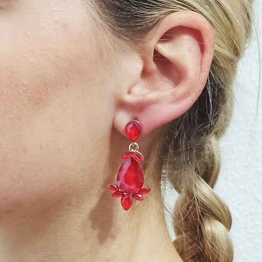 Pendientes Espectaculares Florales · Cristales Rojo, Oro