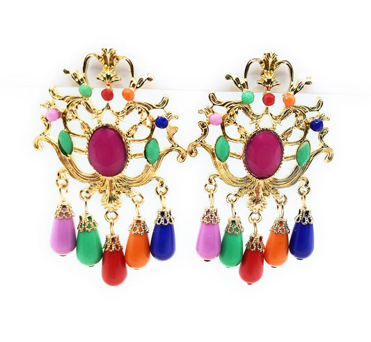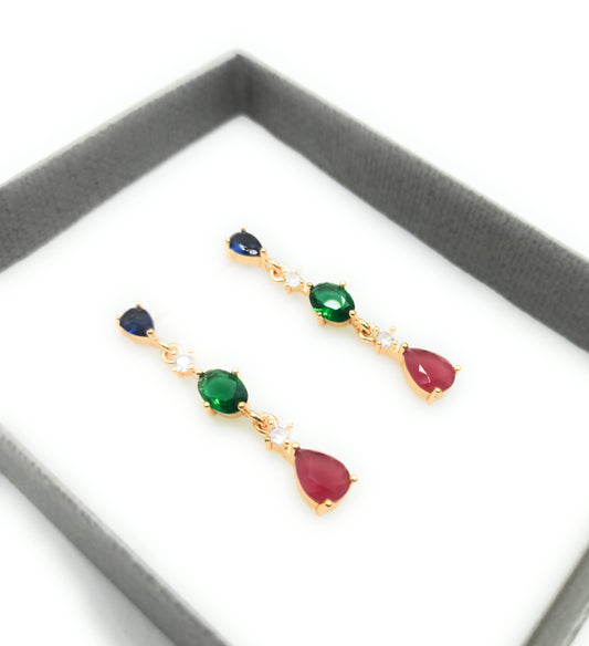 Pendientes Largos Triple Cristales Color · Multicolor Azul Verde Rojo