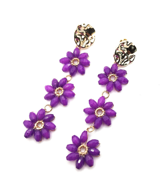 Pendientes Largos Triple Cristales Color · Flores Morado
