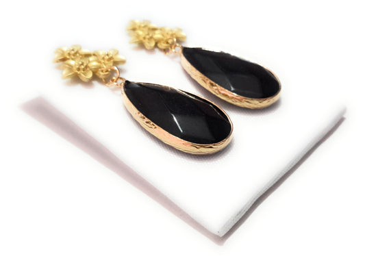 Pendientes Piedra Semipreciosa · Flores Doradas Negro
