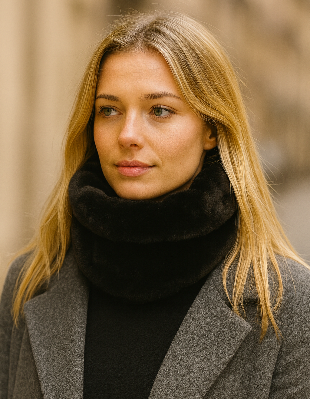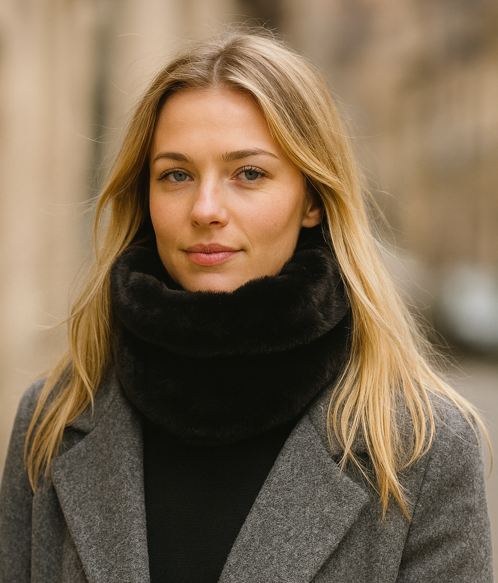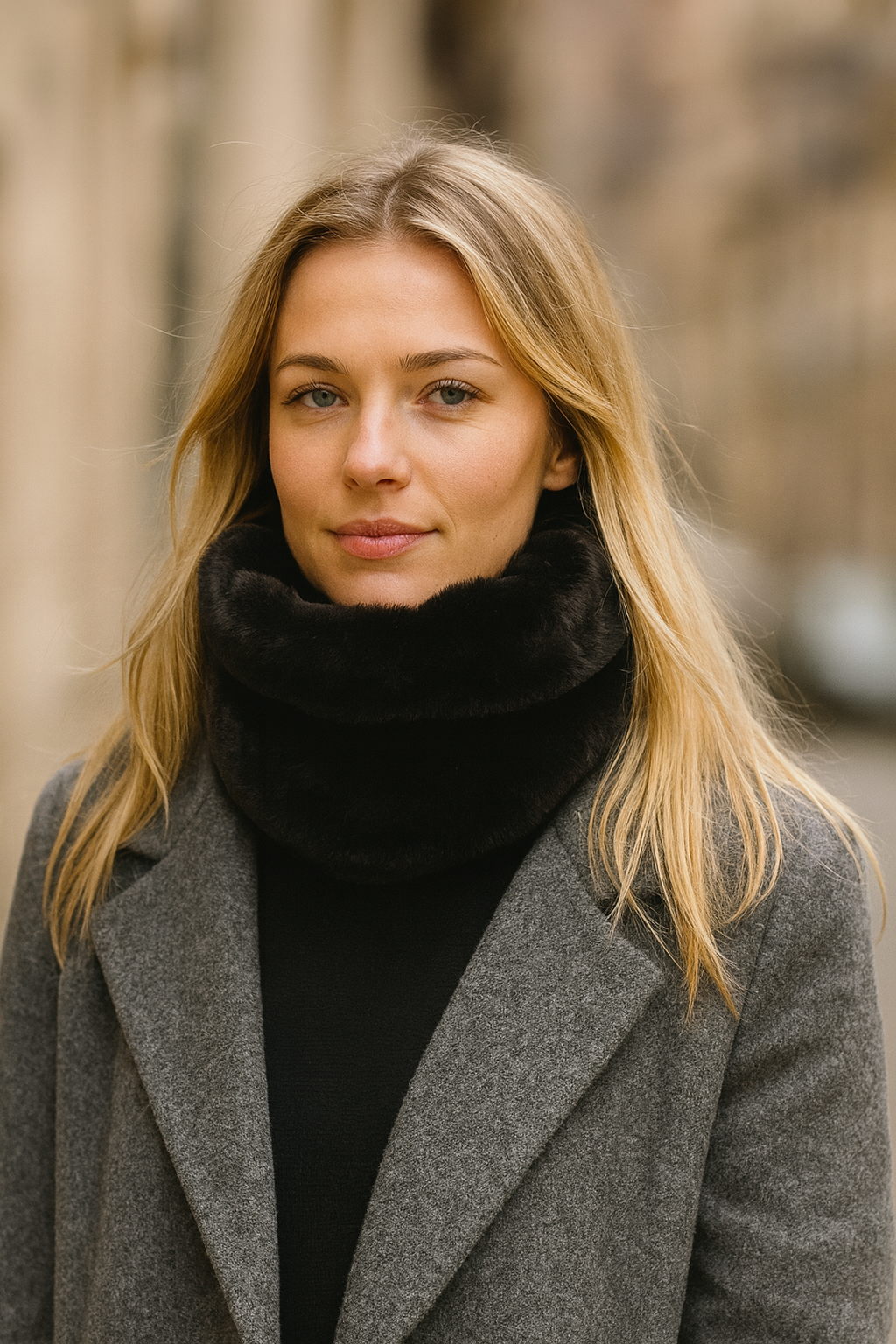 Envuélvete en suavidad con esta bufanda de pelo sintético de alta calidad, un accesorio imprescindible para este invierno. Su diseño tipo cuello cerrado, con pelo sintético por fuera y por dentro, ofrece una calidez excepcional y un tacto tan agradable que parece auténtica piel.