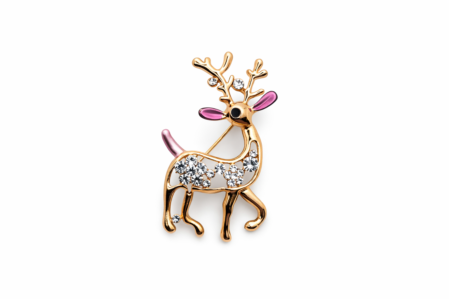 Broche dorado de reno con detalle morado, cristales y circonitas brillantes
