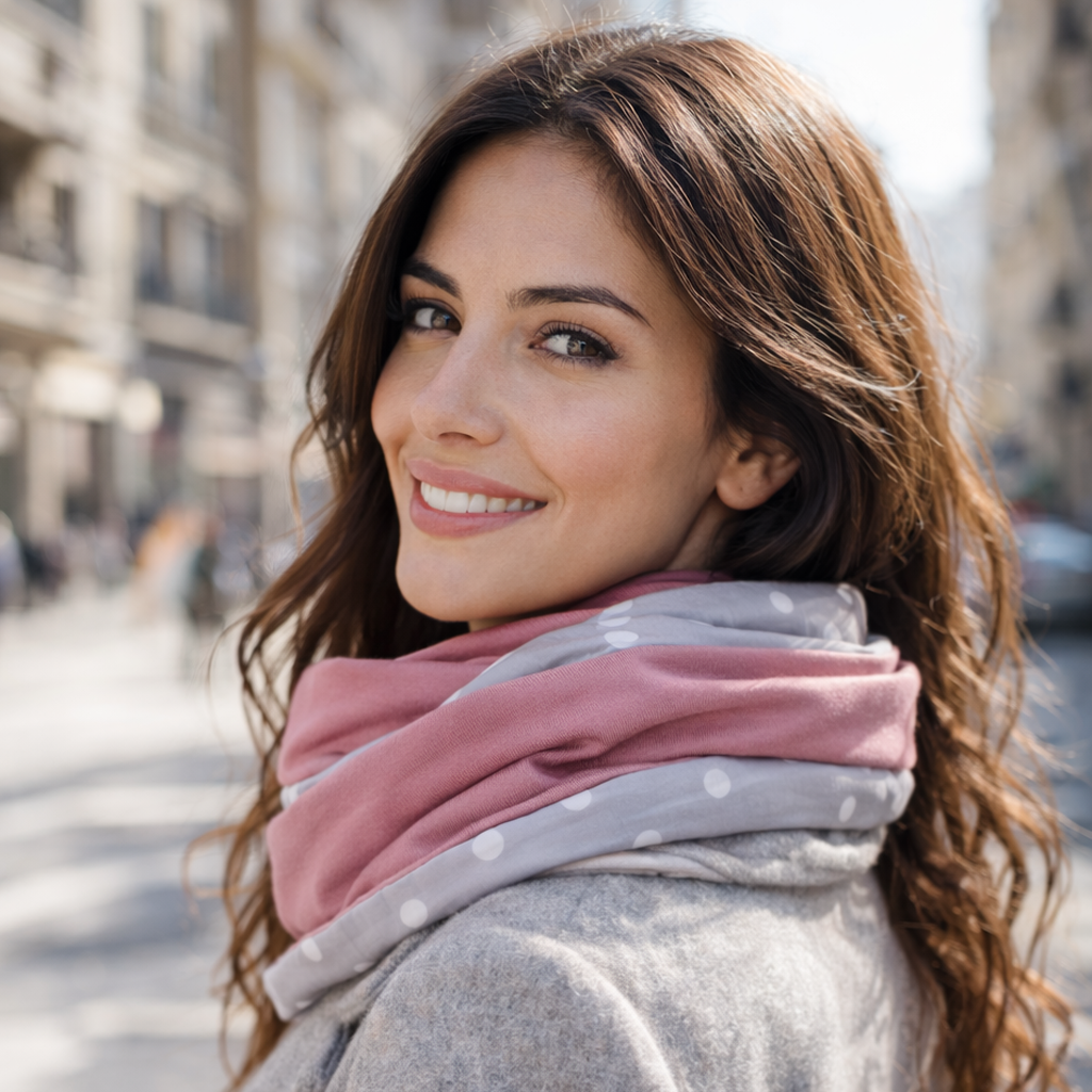 Bufanda Infinita Cuello Mujer Doble Tela Reversible · Lunares Gris/Rosa