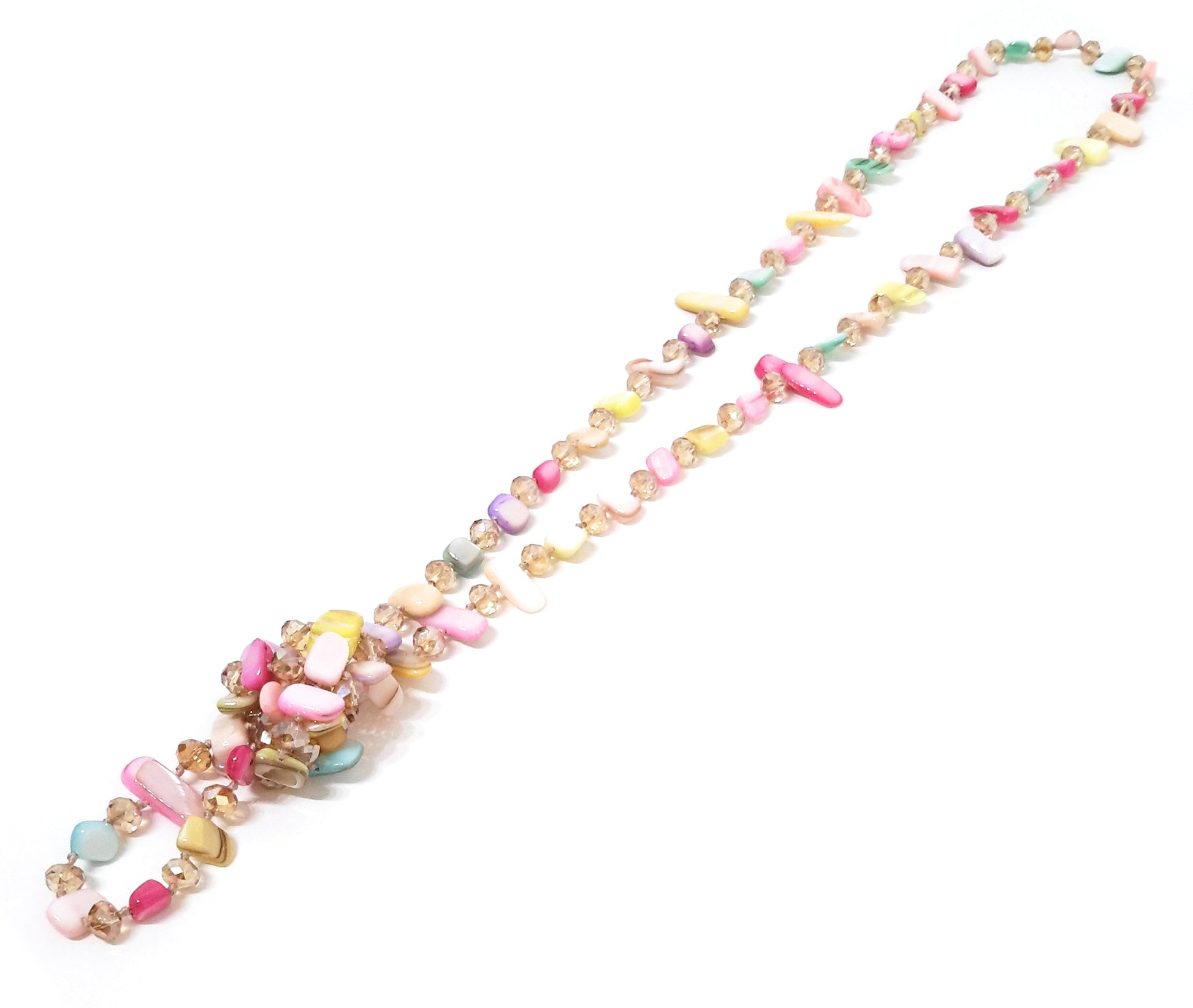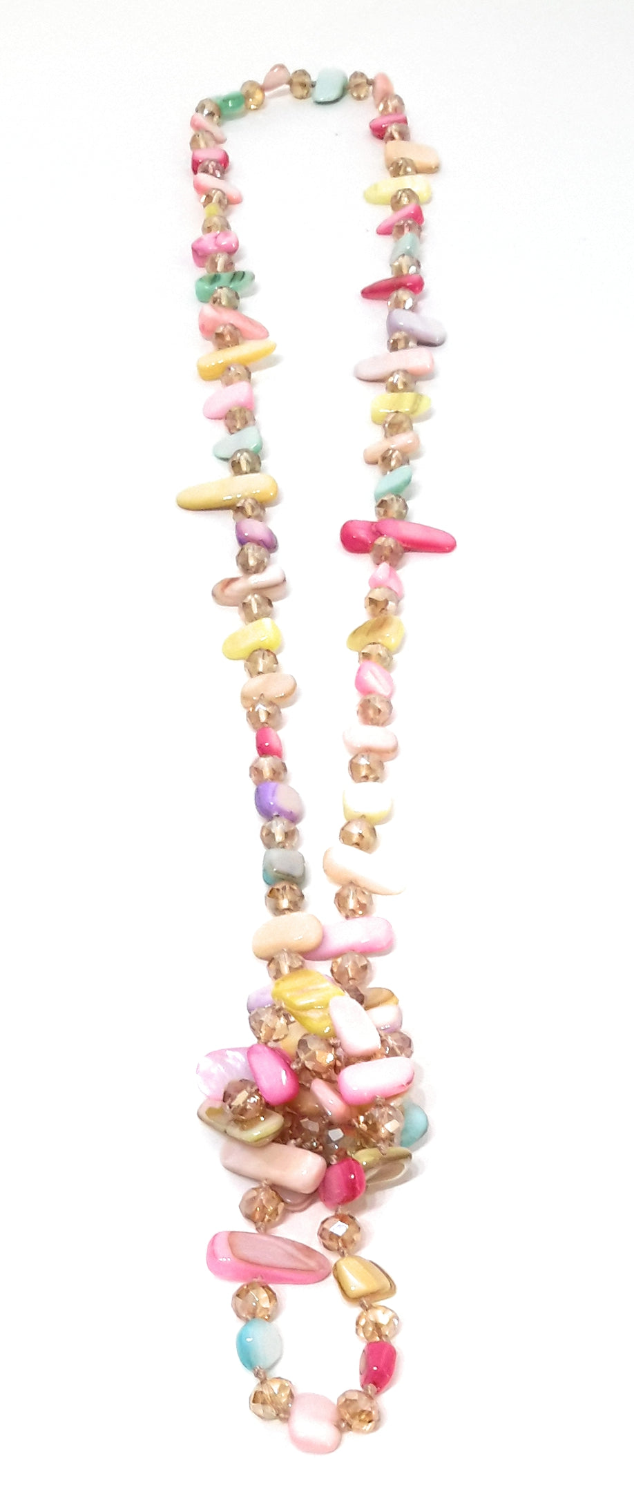 Collar largo anudado de mujer con nácar auténtico y perlas de cristales coloridas.