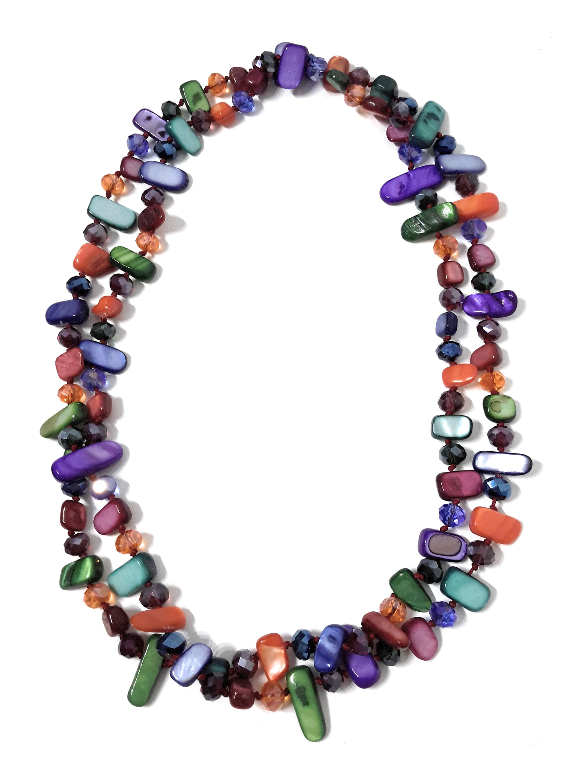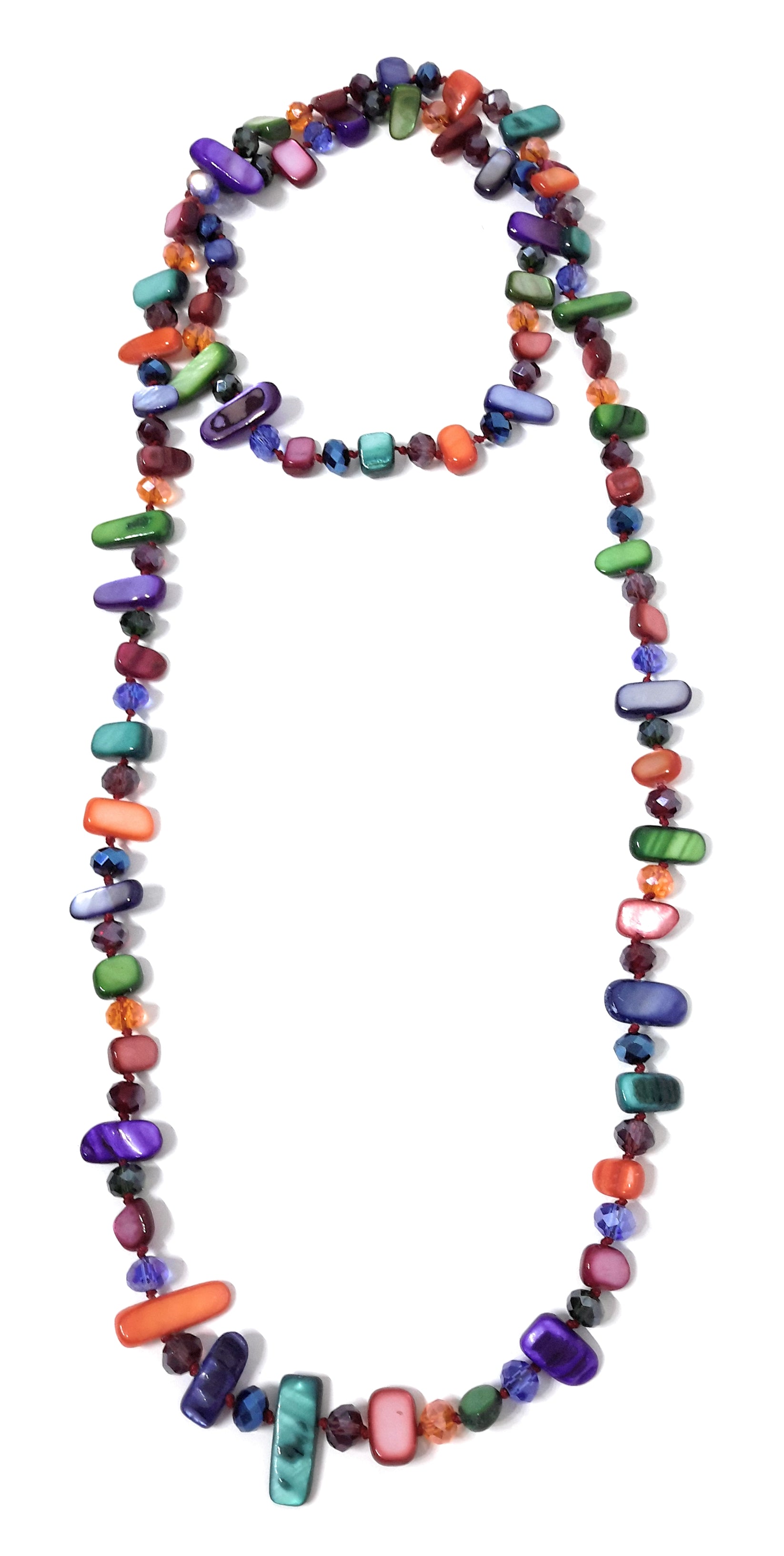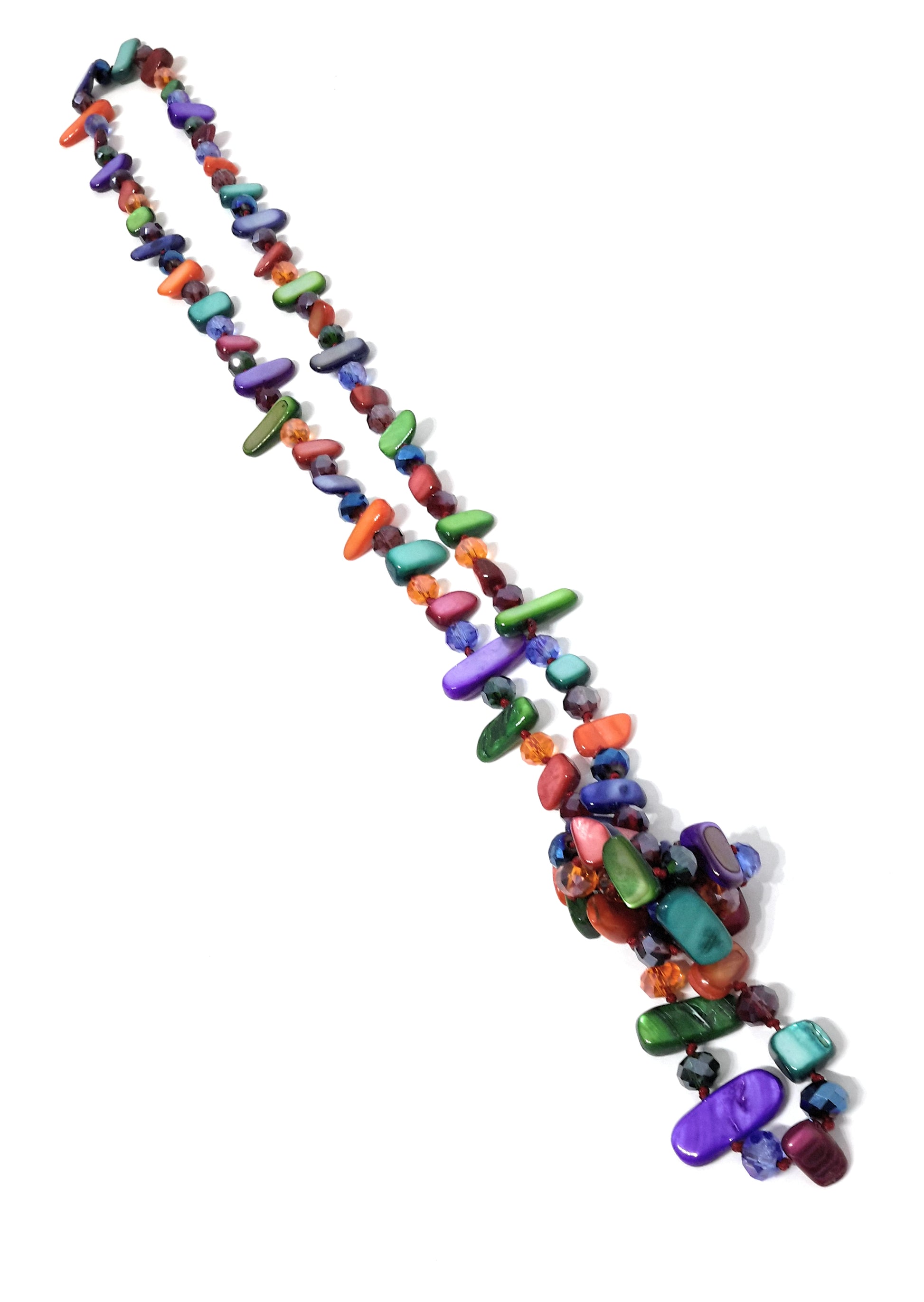 Collar largo anudado de mujer con nácar auténtico y perlas de cristales coloridas.