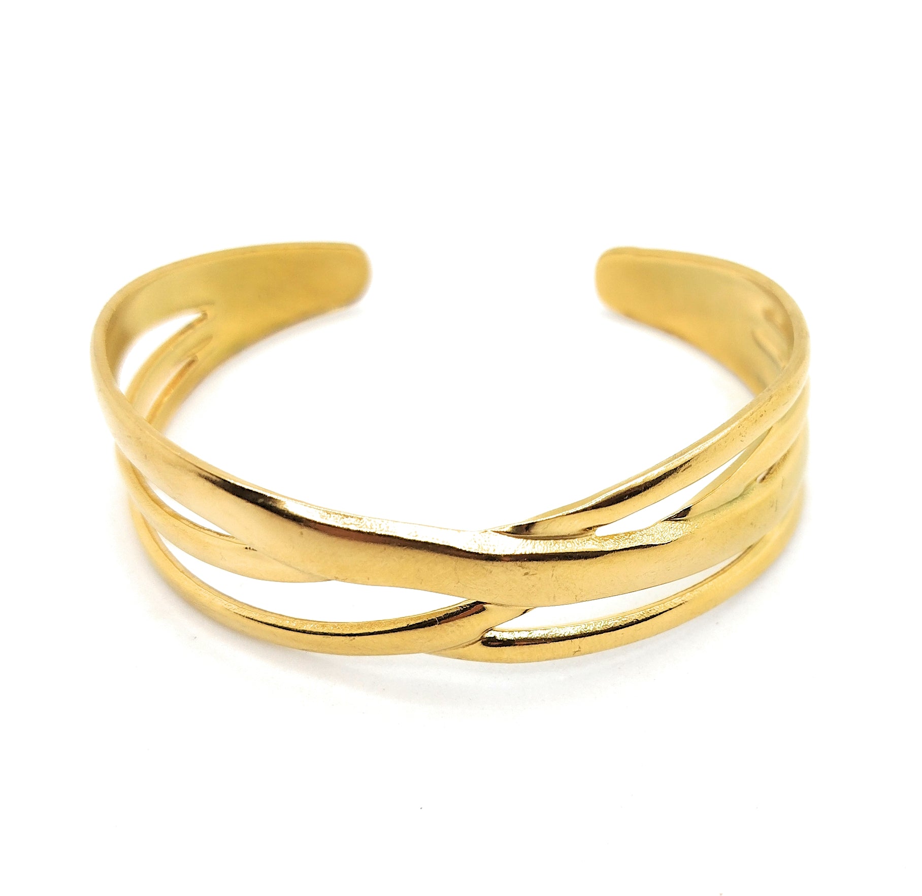 Un diseño cautivador que combina modernidad y sofisticación. Este brazalete dorado, que aparenta estar formado por varios aros entrelazados, es en realidad una sola pieza rígida cuidadosamente modelada para crear un efecto envolvente y armonioso.
