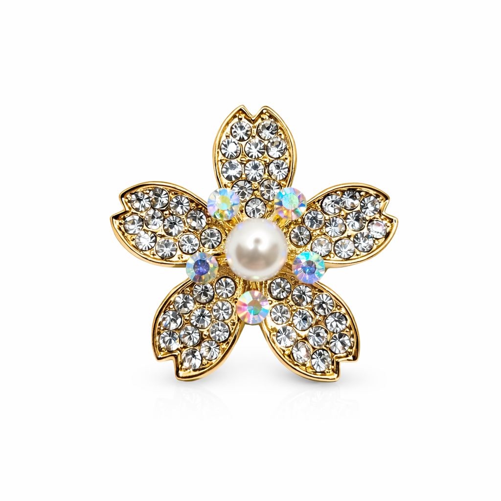 Broche joya dorada en forma de flor con perla central y cristales