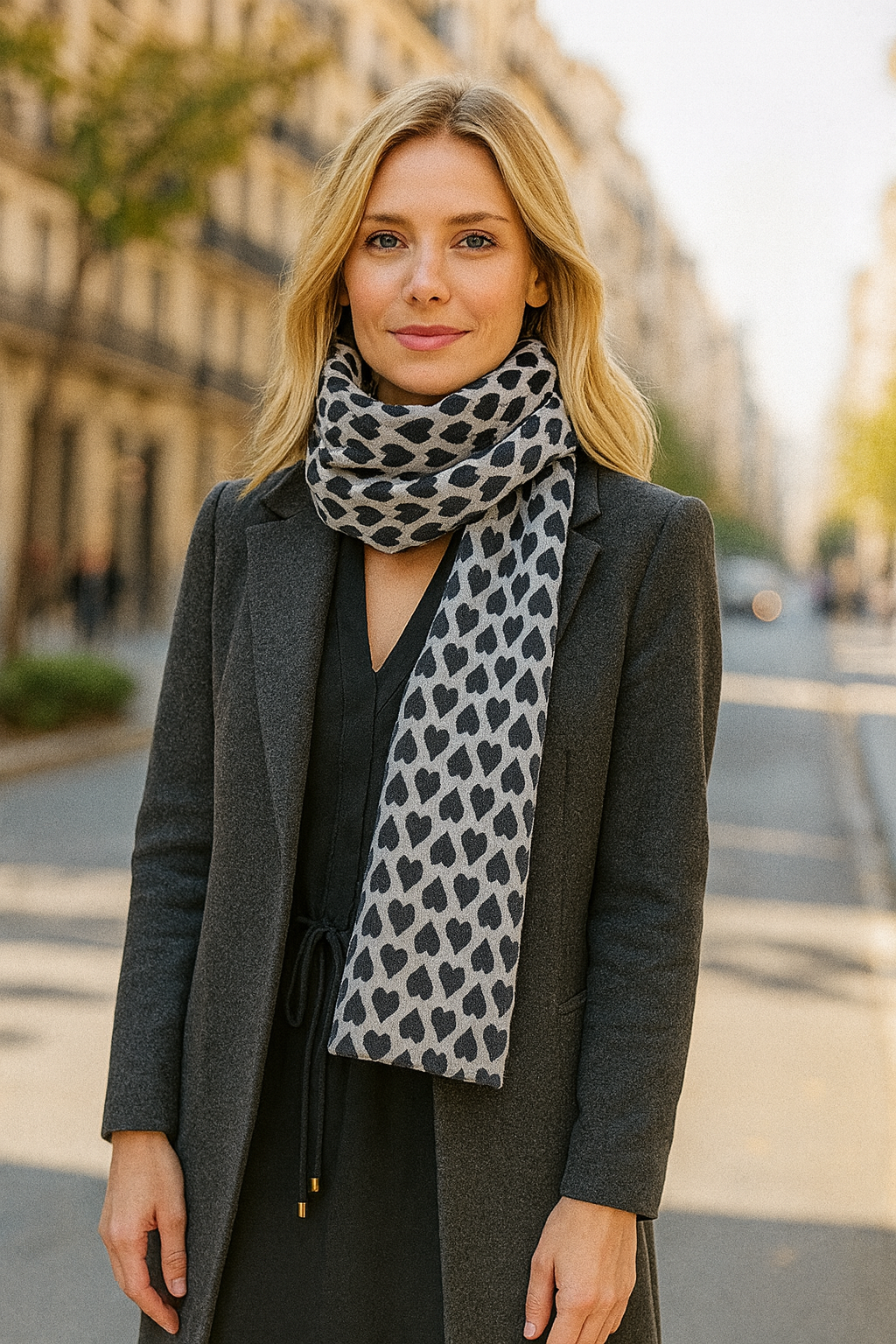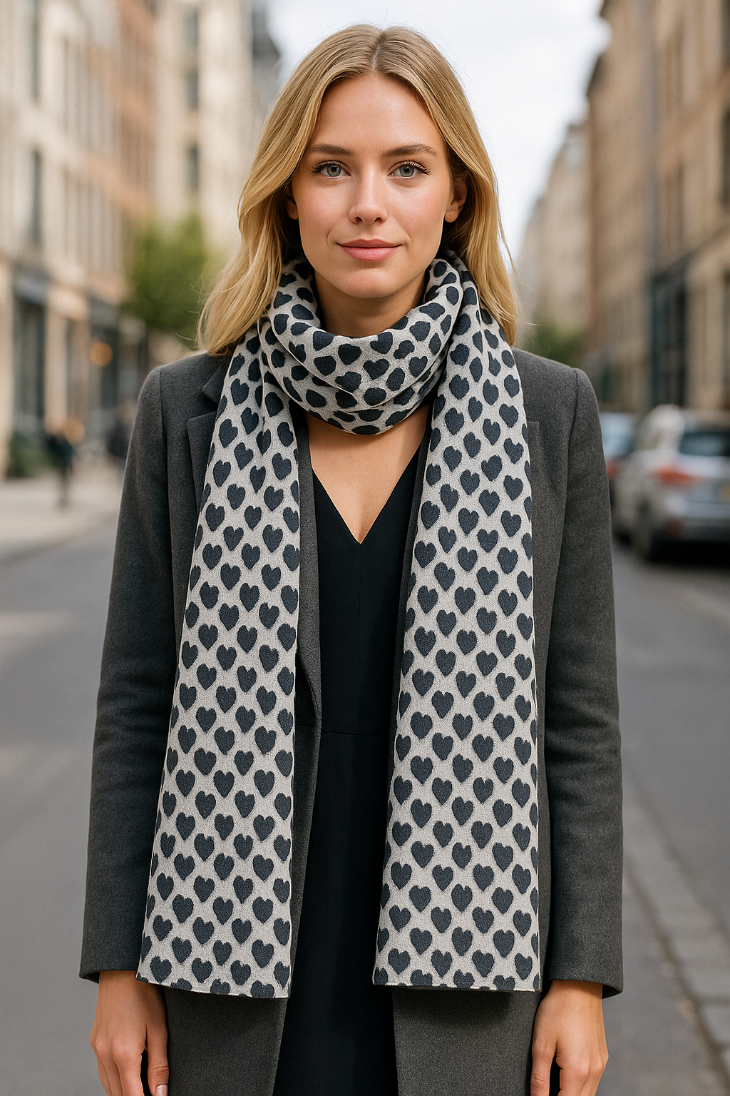 Bufanda Grande Reversible · Corazones Negro Blanco
