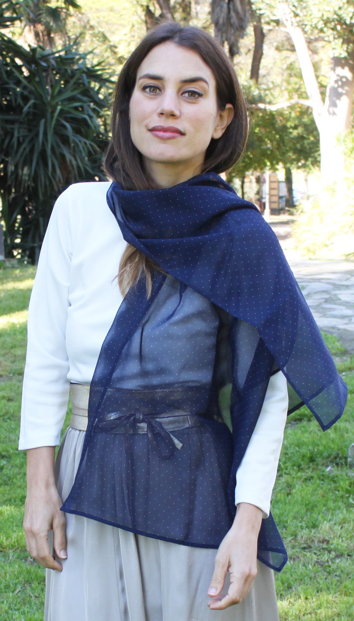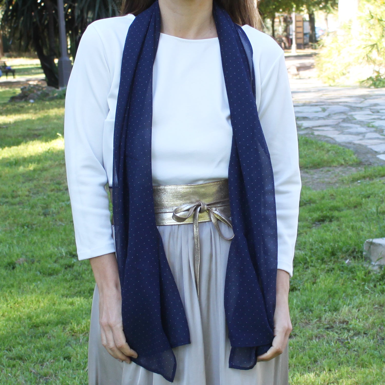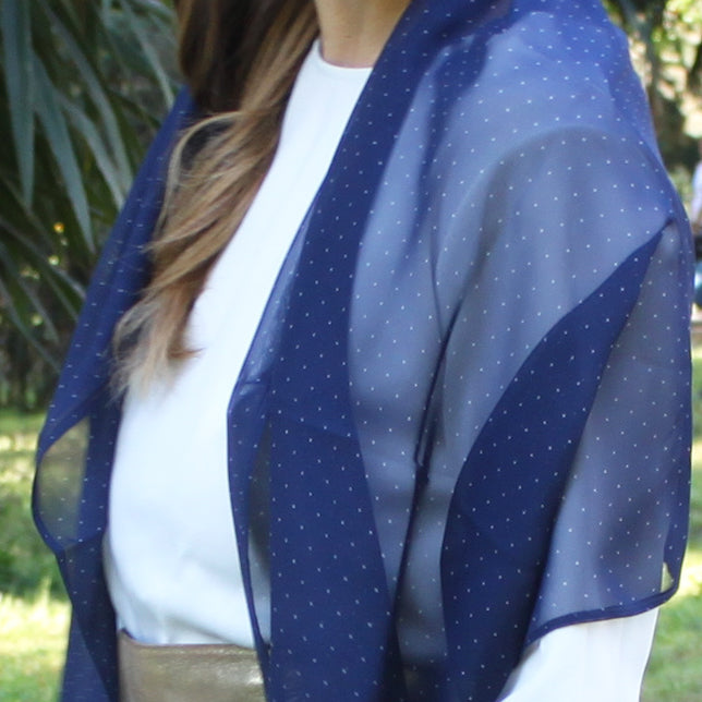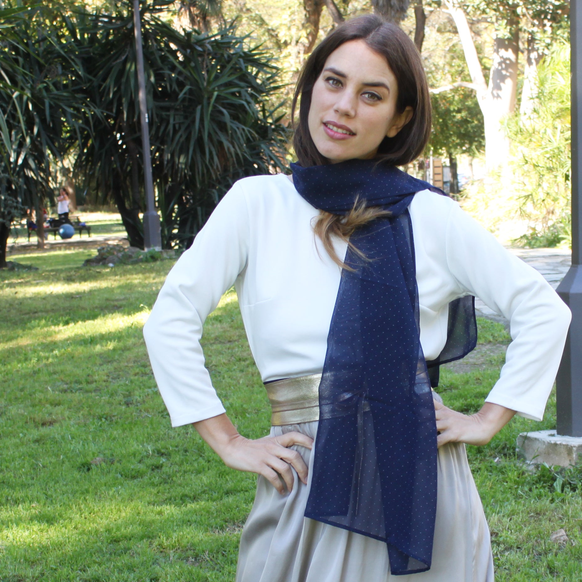 Chal de Fiesta Chifón · Azul Marino con Lunares Blancos (50x150cm)