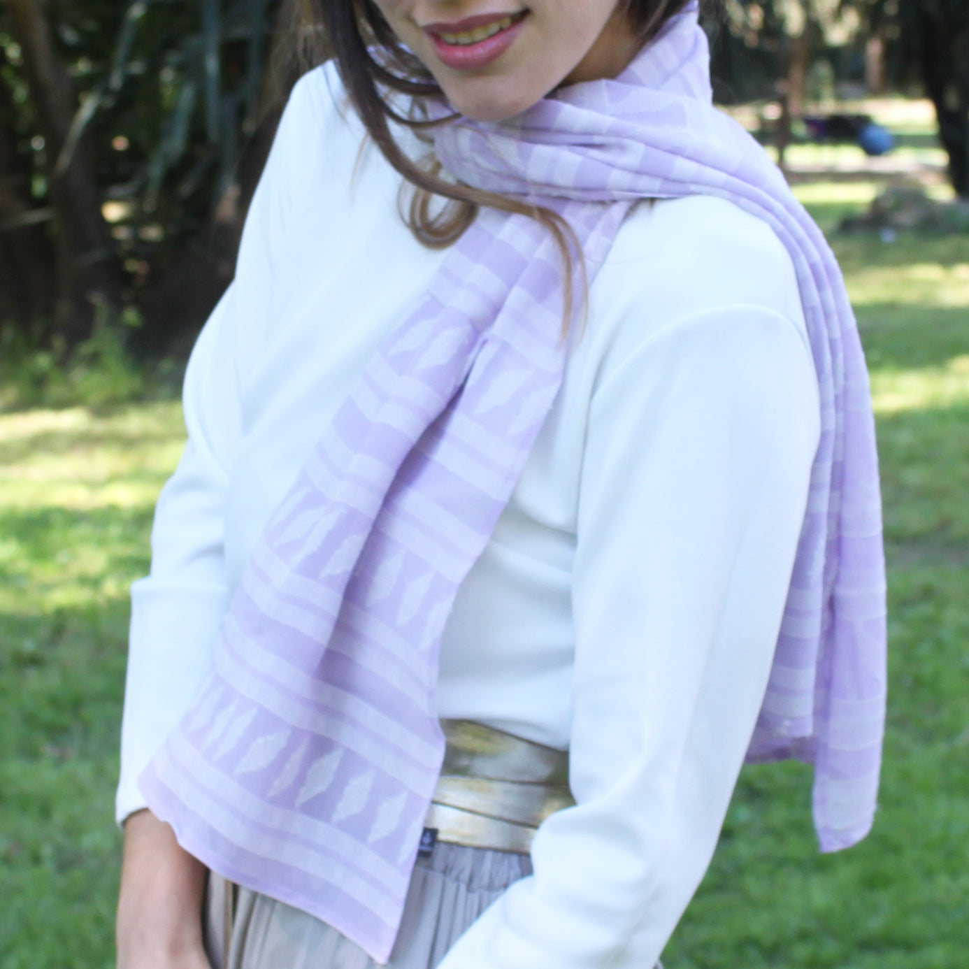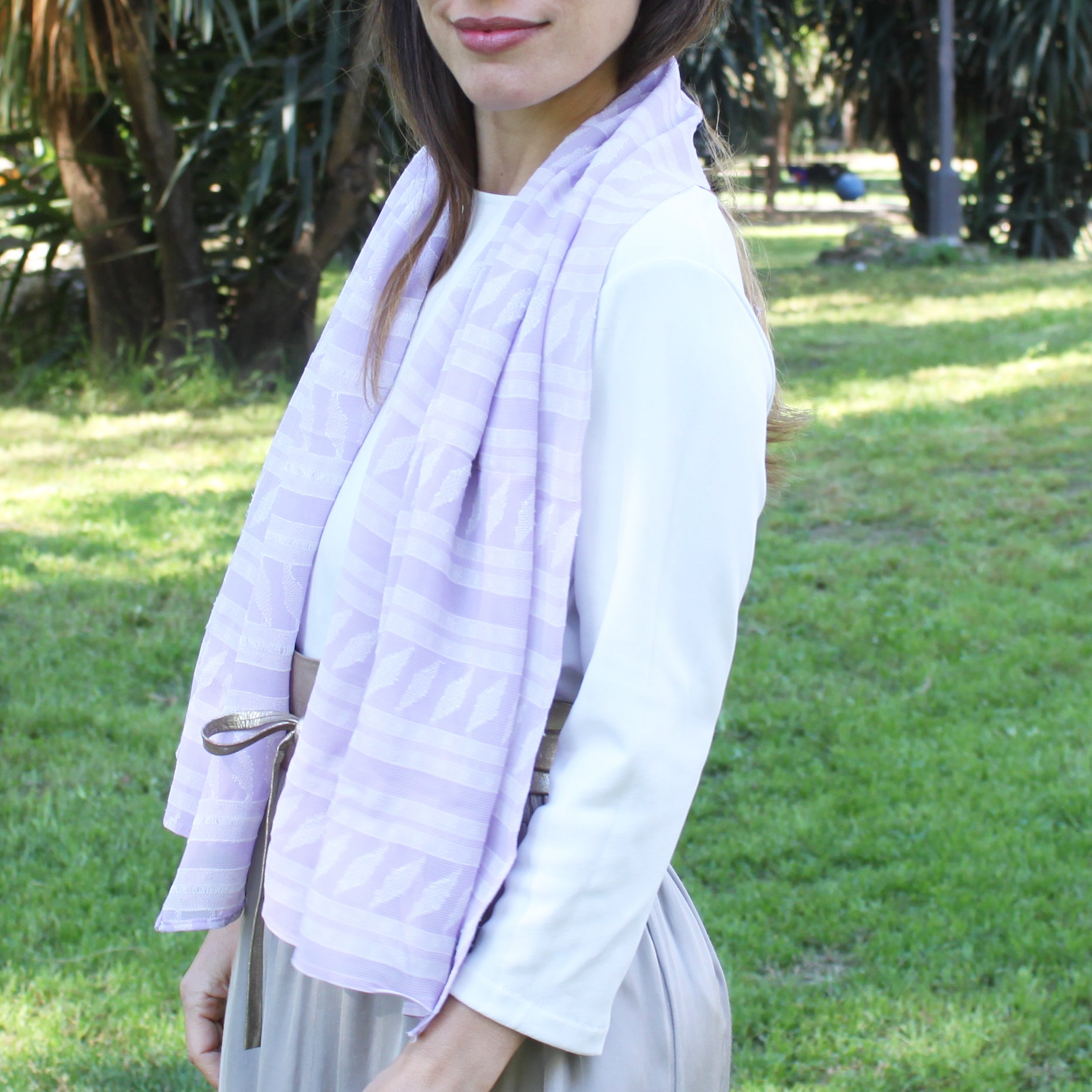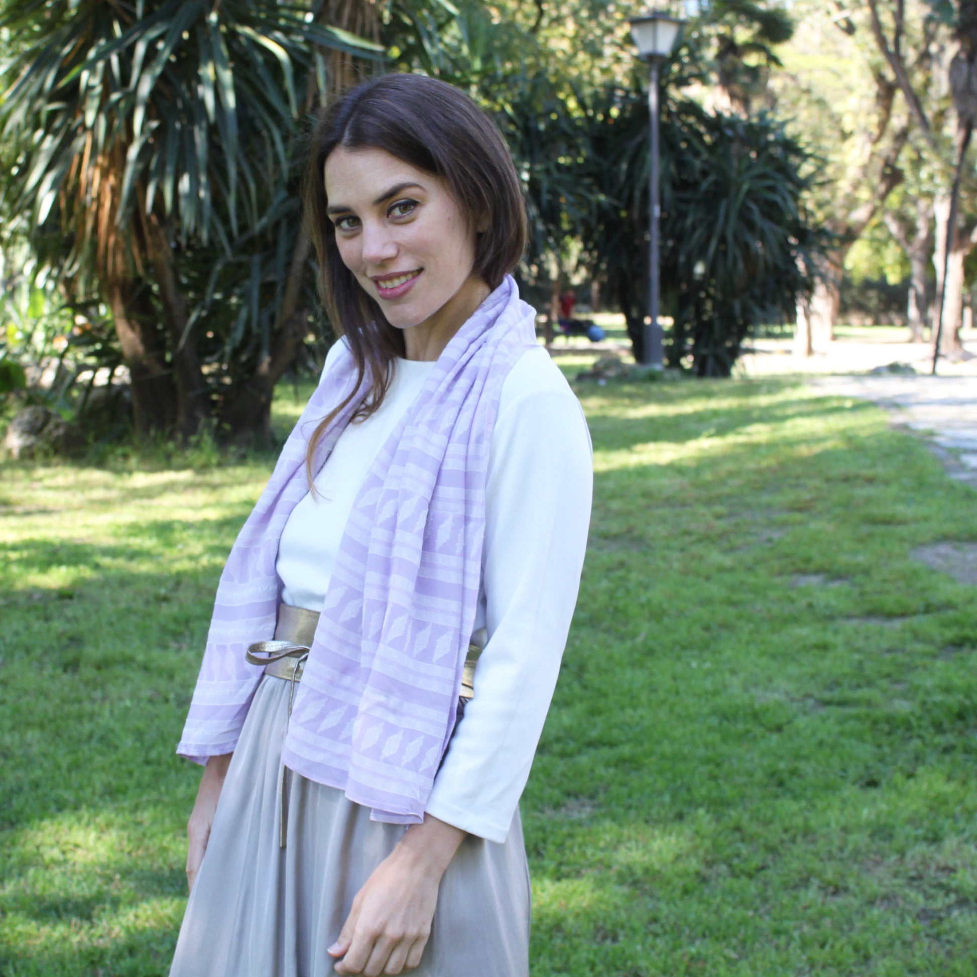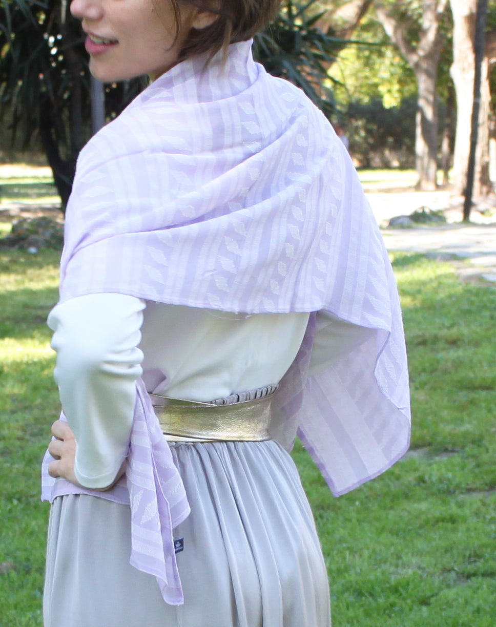 Chal Estola Bordado Viscosa y Algodón – Hecho a Mano en Sevilla · Lavanda y Blanco Roto (50x150cm)