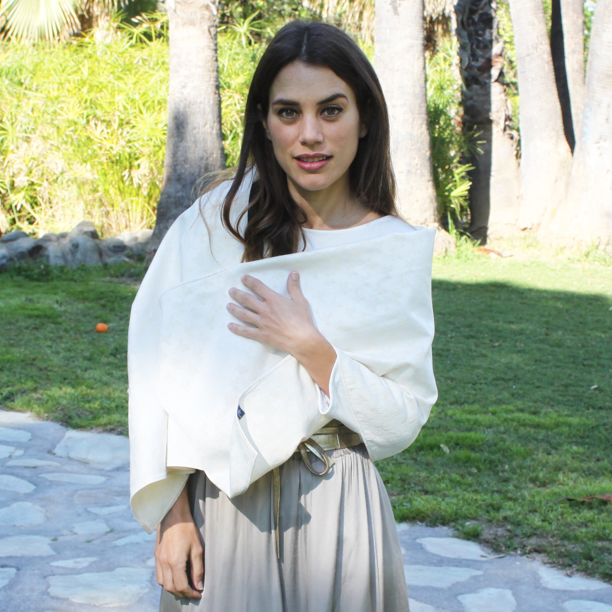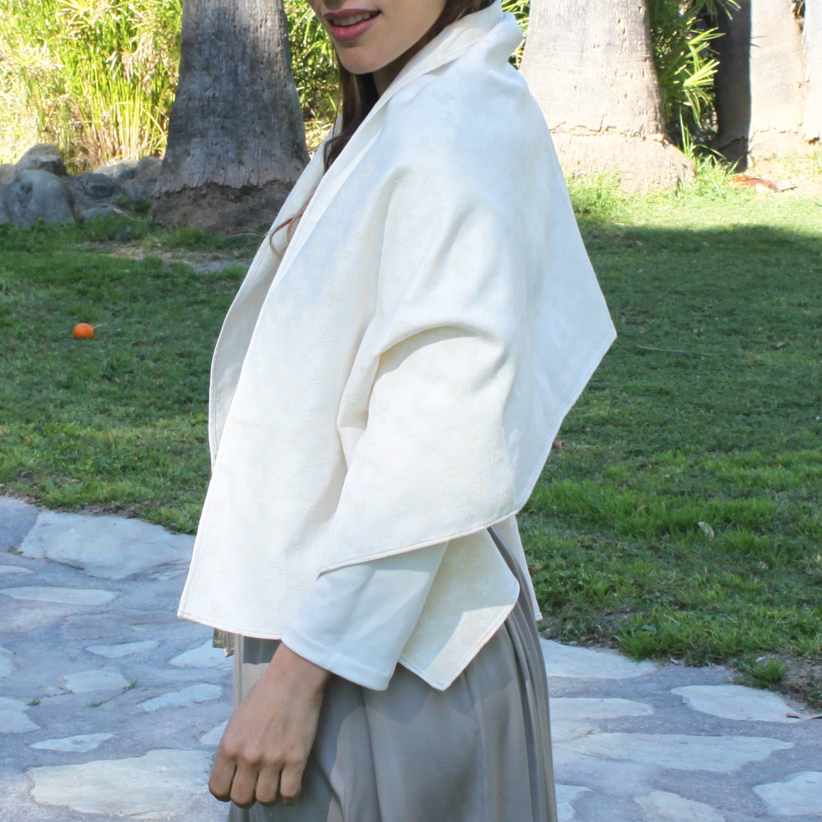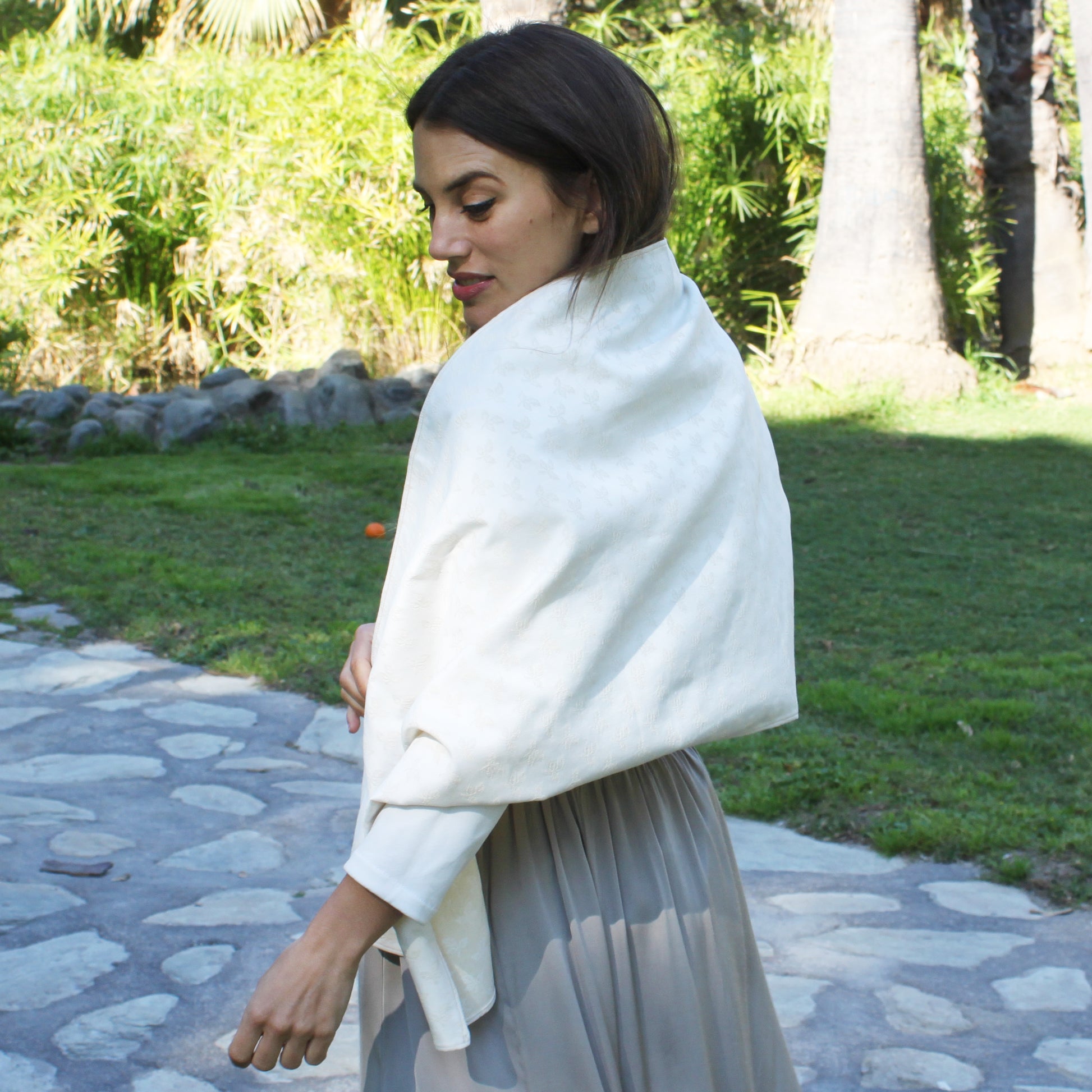 Eleva tu look con este chal de fiesta estilo Jacquard, confeccionado en un tejido con relieve de hojas que aporta textura, cuerpo y distinción. Su tono blanco roto, sofisticado y luminoso, lo convierte en el accesorio perfecto para bodas, comuniones, bautizos y eventos especiales.