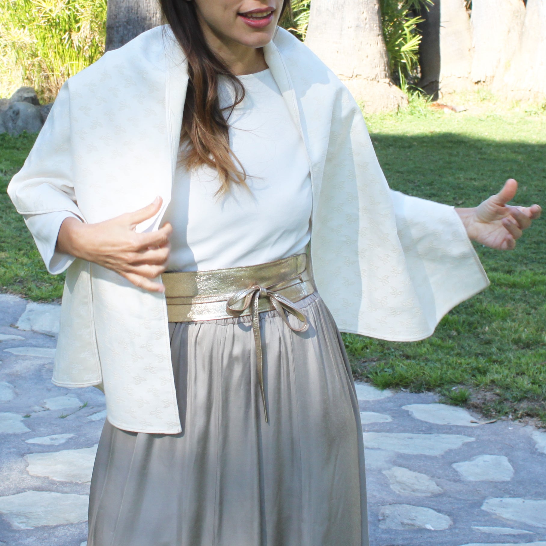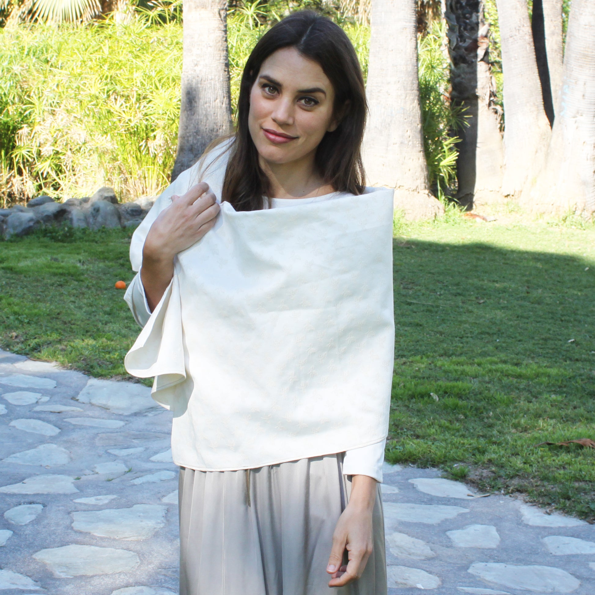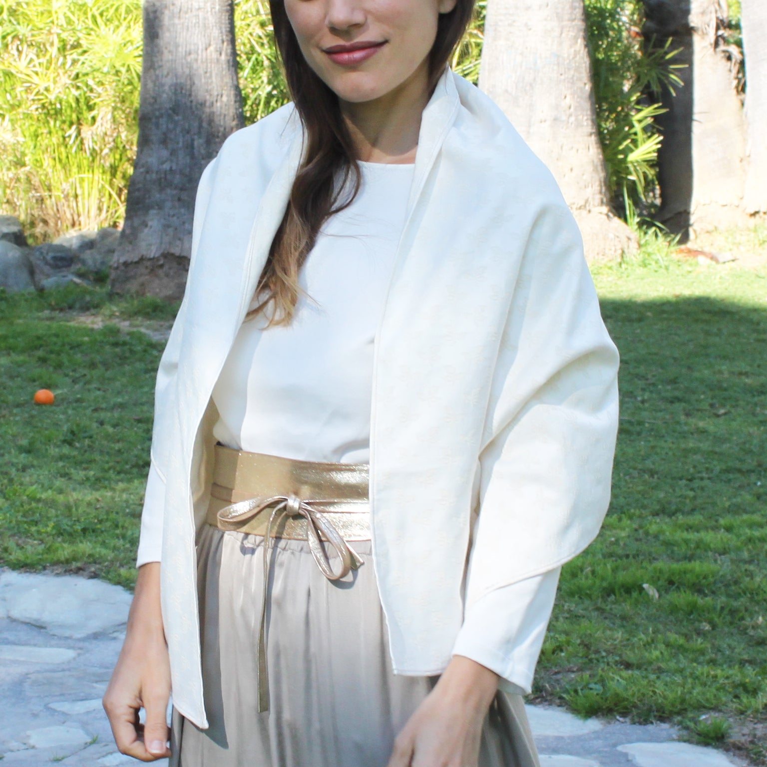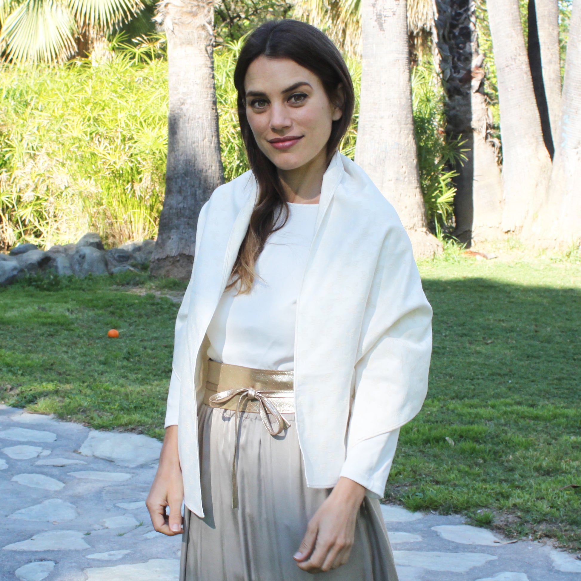 Eleva tu look con este chal de fiesta estilo Jacquard, confeccionado en un tejido con relieve de hojas que aporta textura, cuerpo y distinción. Su tono blanco roto, sofisticado y luminoso, lo convierte en el accesorio perfecto para bodas, comuniones, bautizos y eventos especiales.