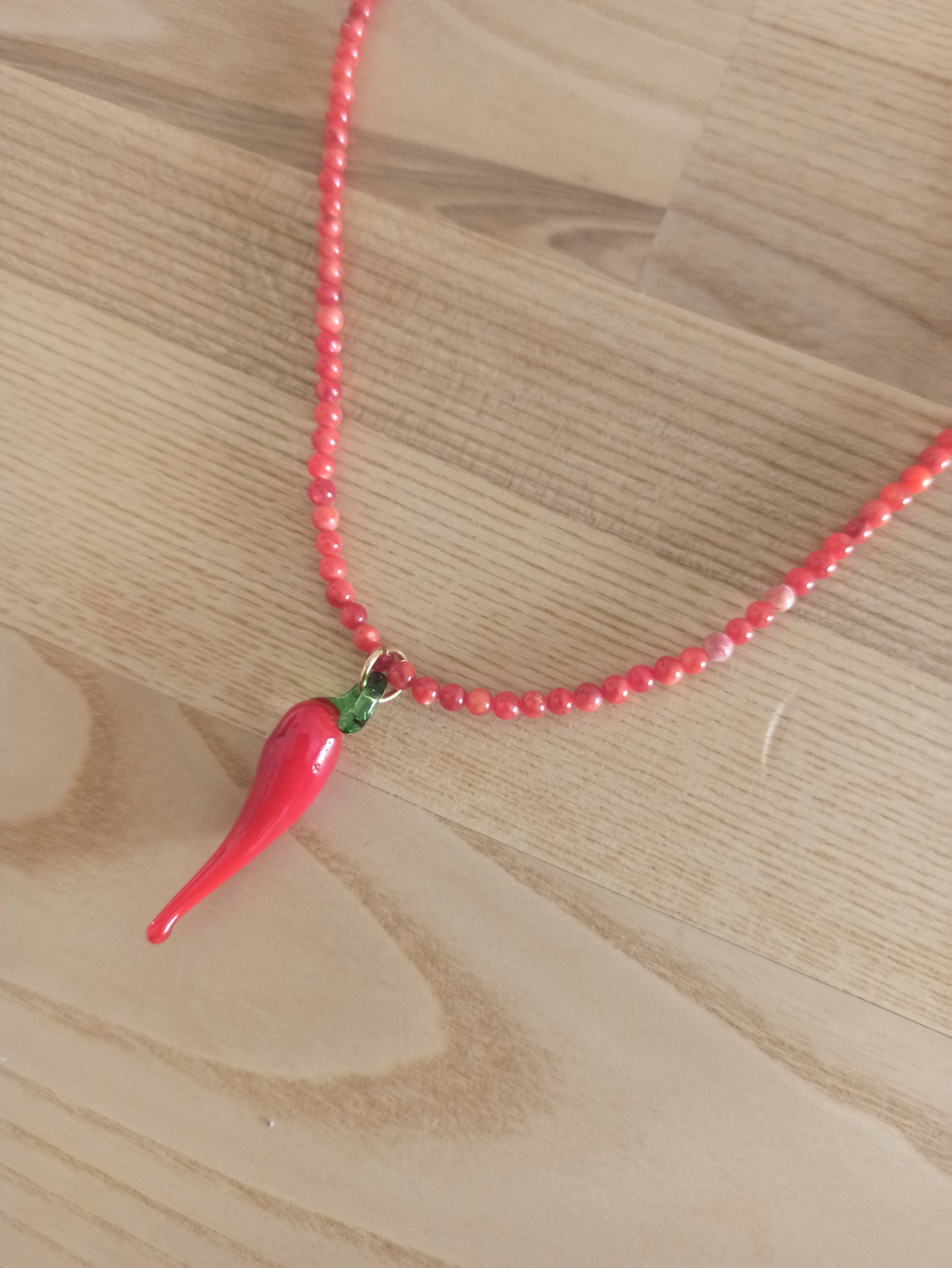 - Materiales: Cuentas de bolitas con piedras semipreciosas naturales y colgante de cristal en forma de chili artesanal.