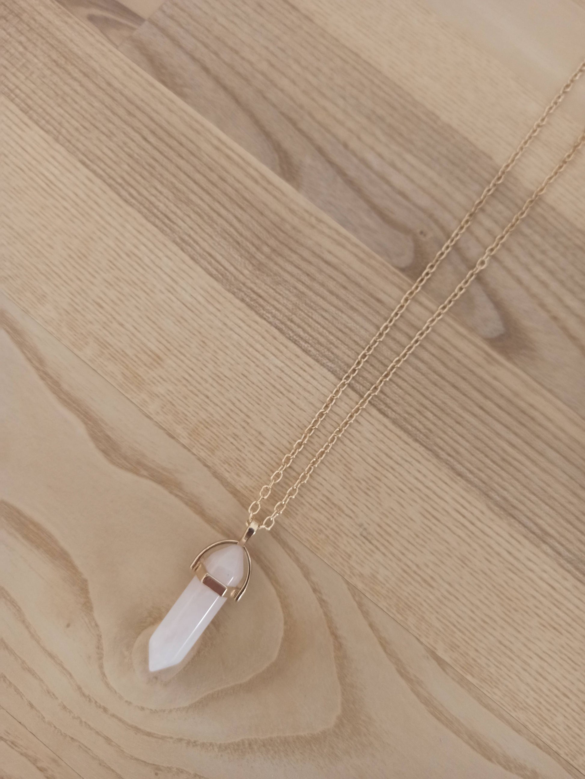 Péndulo Hexagonal de Piedra Semipreciosa Natural con Collar Corto Dorado · Cuarzo Rosa (últimas unidades!)