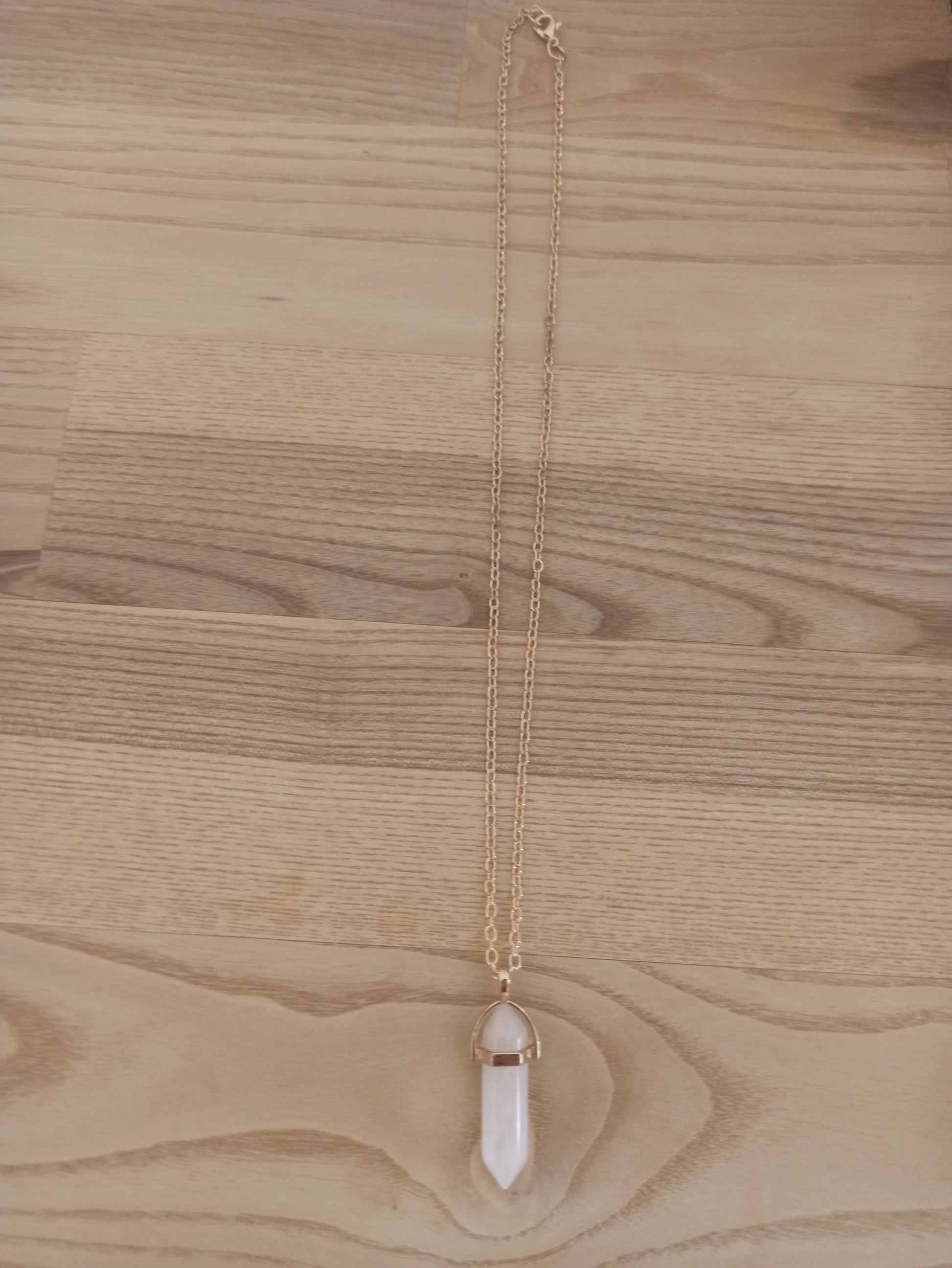 Descubre nuestro Collar corto con colgante de péndulo hexagonal, elaborado con piedra semipreciosa natural y montado sobre una delicada cadena dorada. Una pieza única que combina diseño moderno con la fuerza y el simbolismo de las piedras naturales.