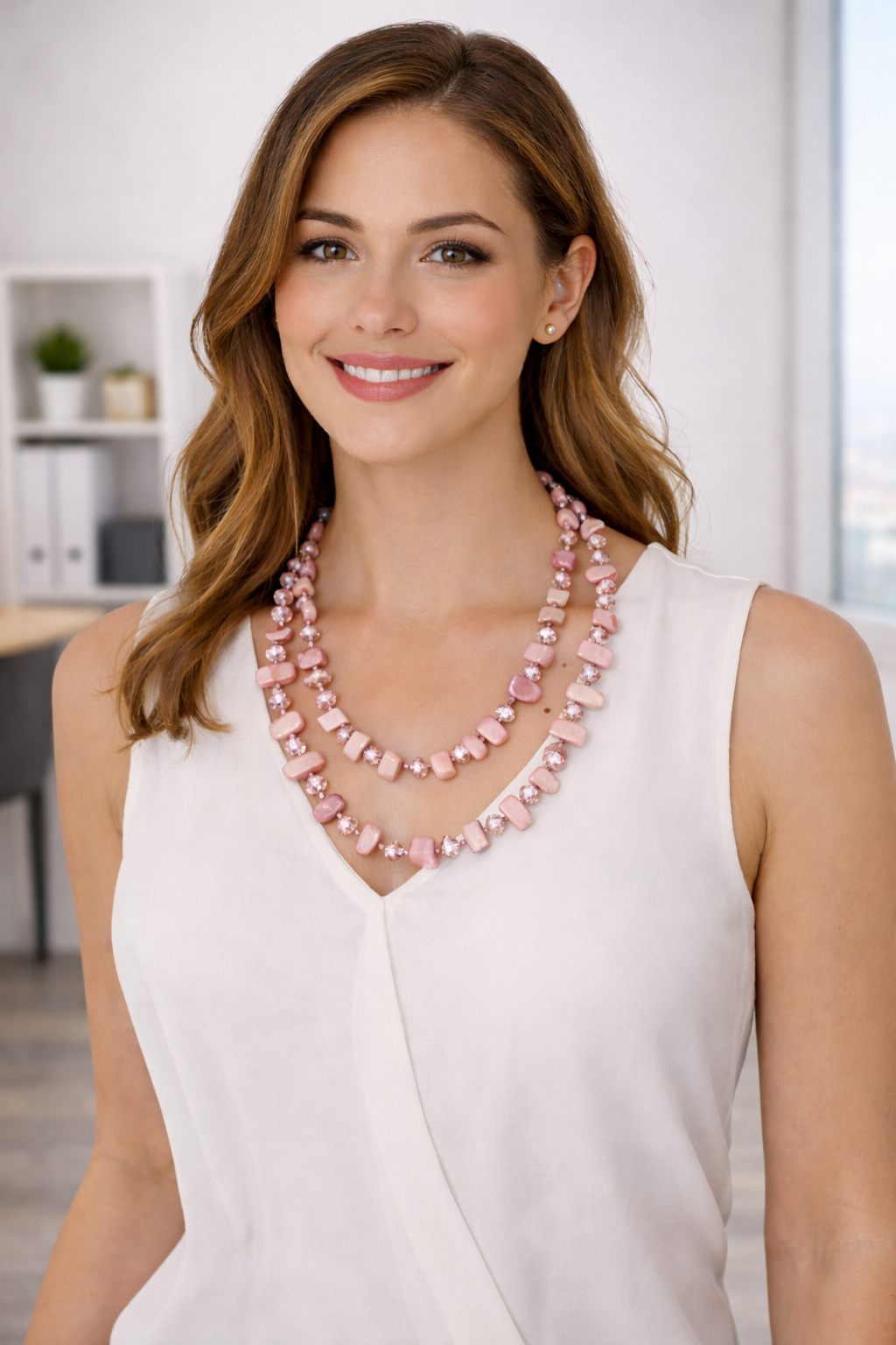 Collar largo de nácar natural, con delicadas cuentas de cristal facetado, anudadas una a una de forma artesanal. Su brillo suave y elegante ilumina cualquier look y combina con todos los colores. Puede llevarse suelto, anudado o en doble vuelta. Largo aproximado: 60 cm. Una pieza especial, ligera y llena de encanto.
