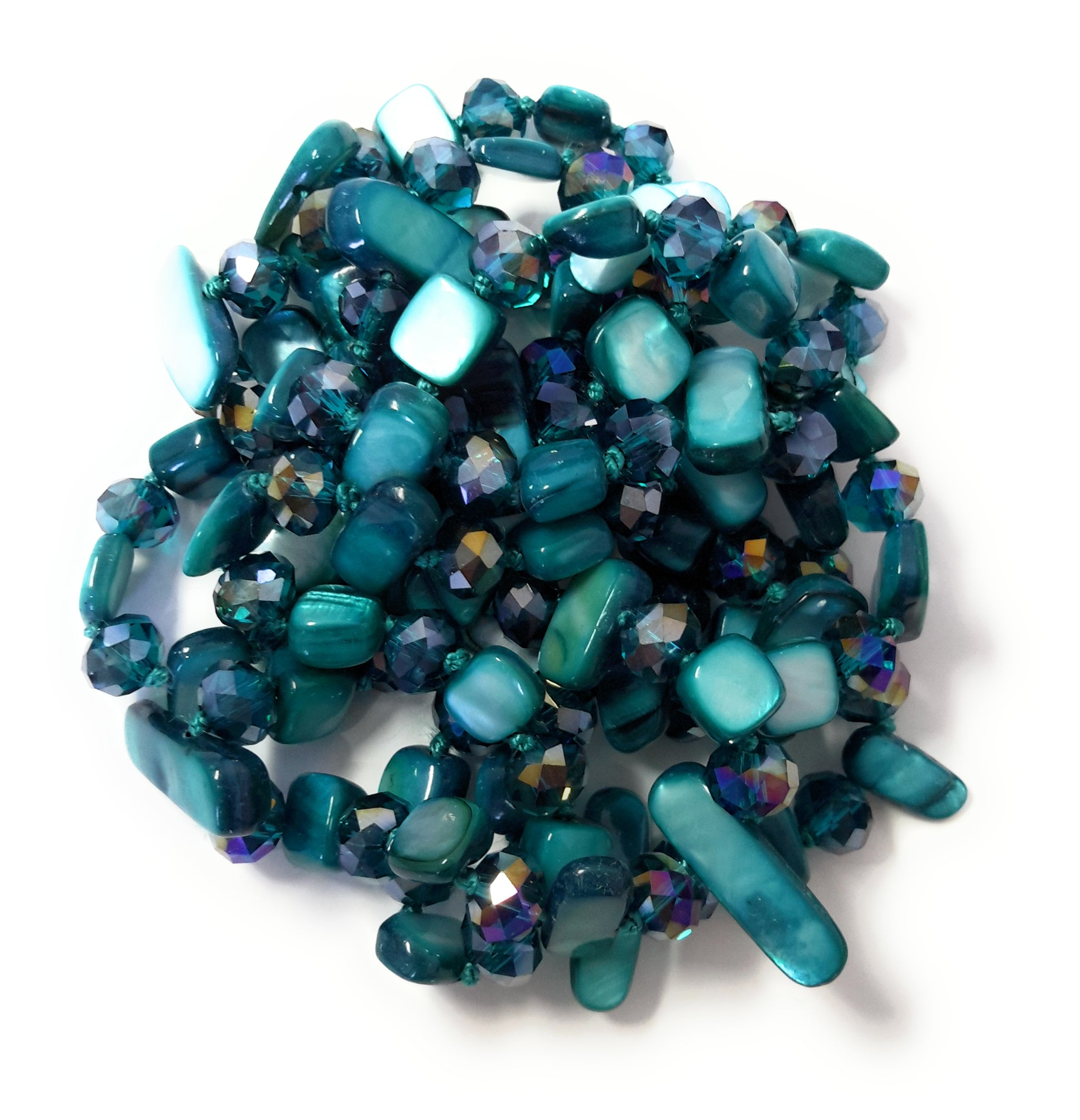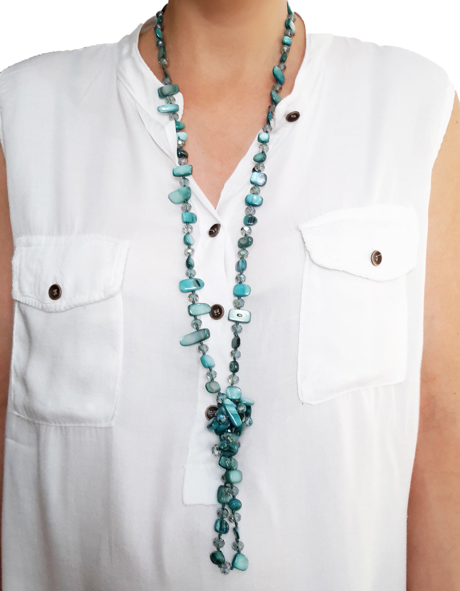 Collar largo anudado de mujer con nácar auténtico y perlas de cristales coloridas.