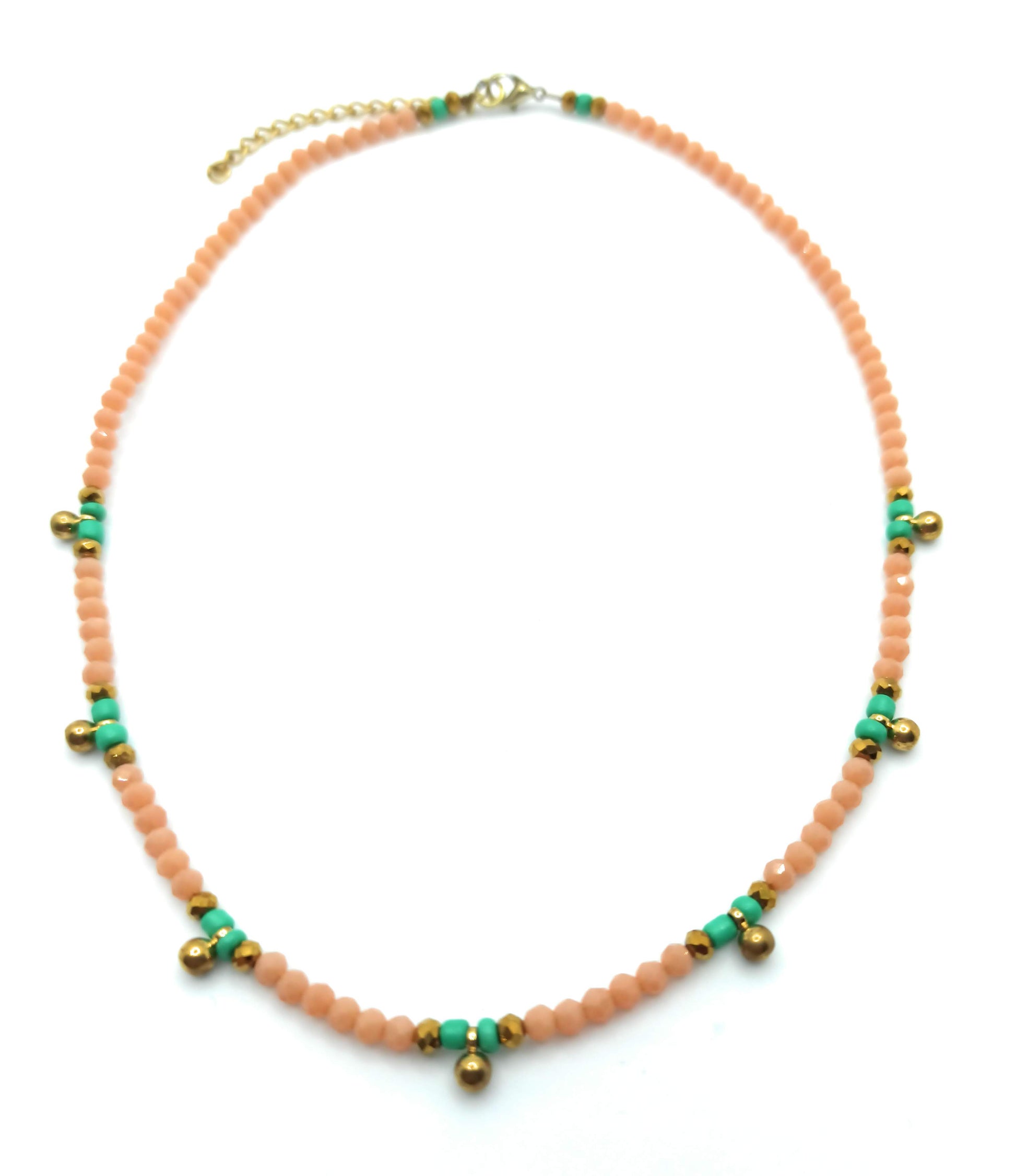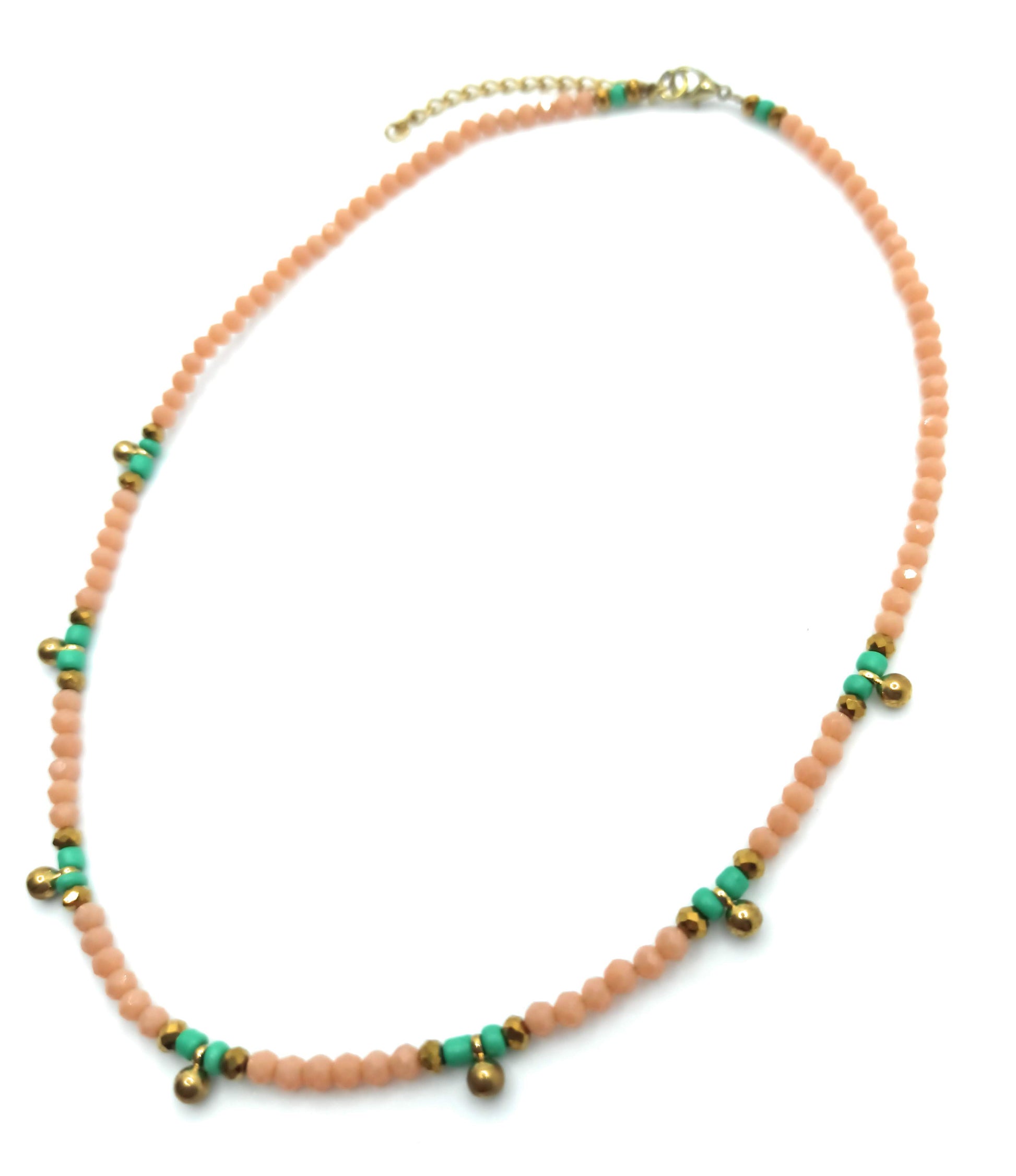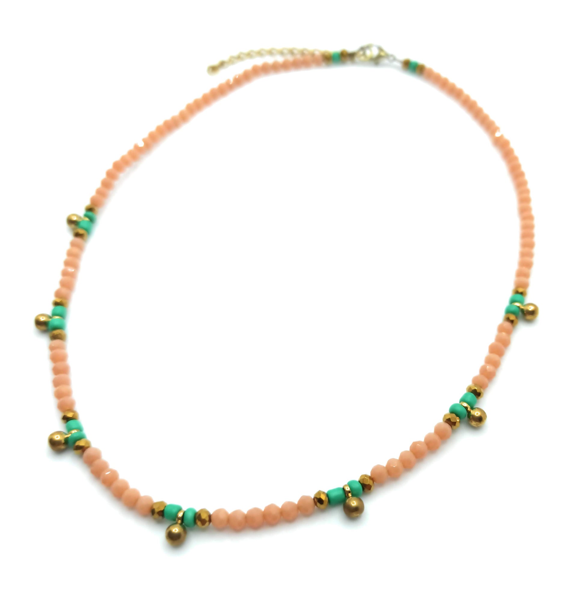 - Gargantilla de cristales facetadas coloridas y cuentas doradas