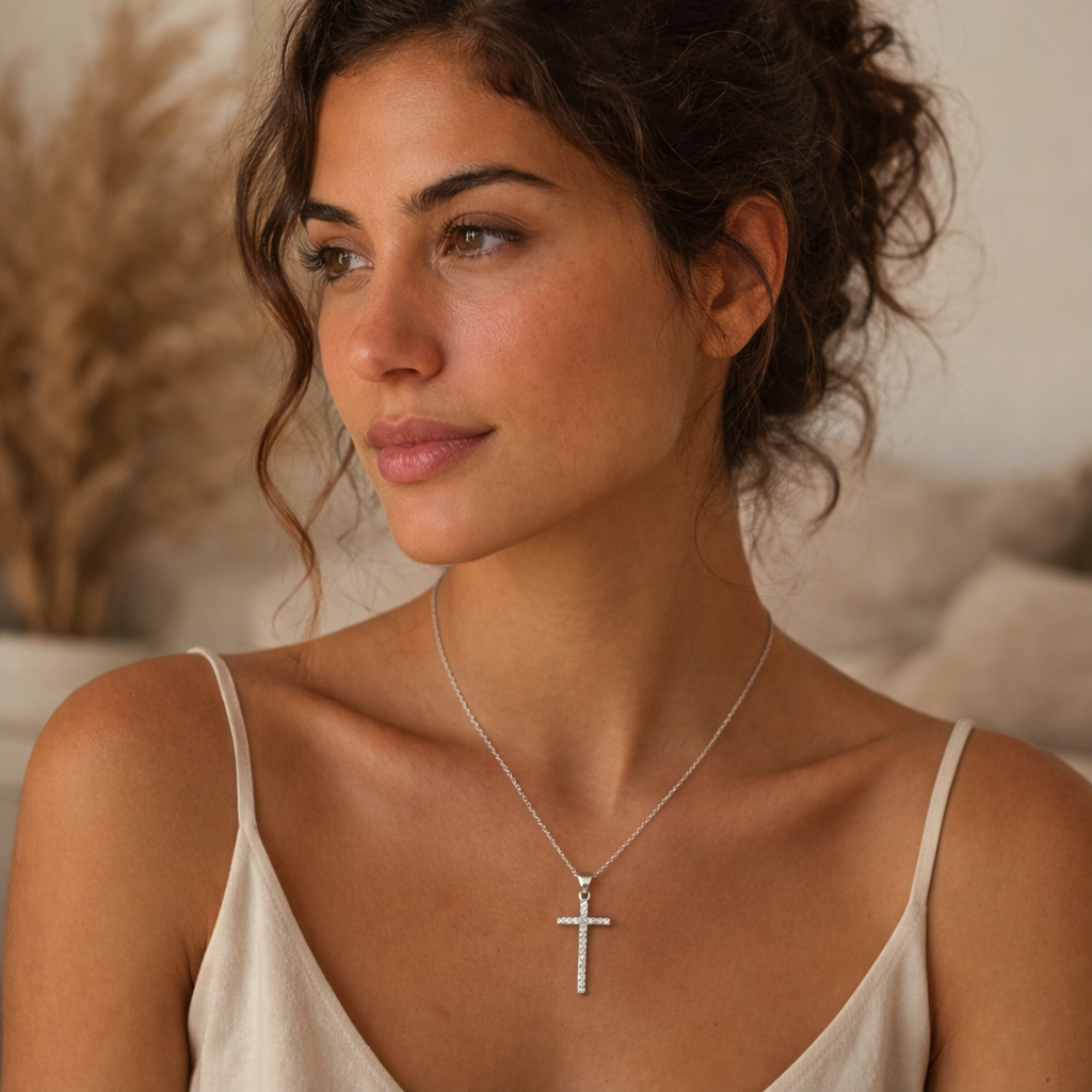 Gargantilla Plateada · Collar corto con Colgante de Cruz con Circonitas