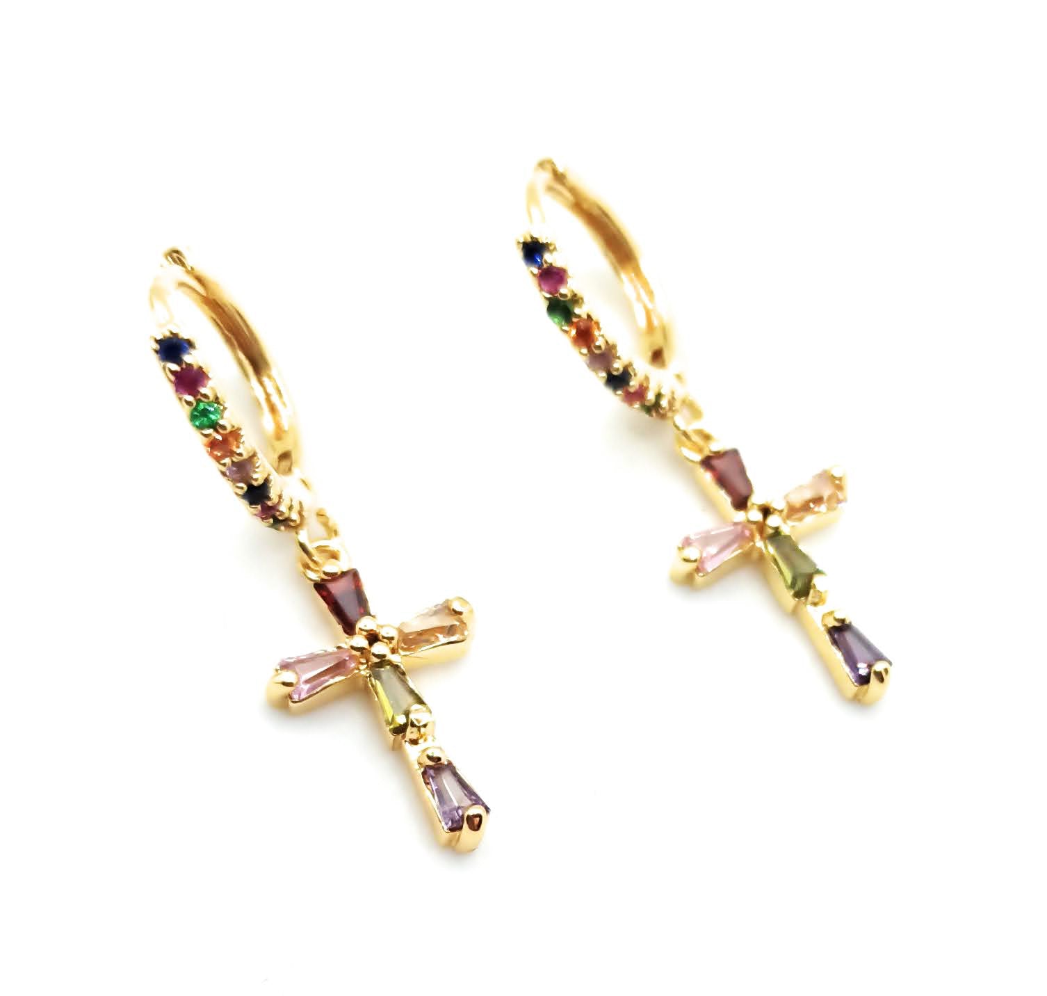 Son unos pendientes muy especiales que aportan mucho estilo gracias a los Cristales Facetados de Circonitas cúbicas incrustadas en el aro y en el colgante de la Cruz. Son Circonitas cúbicas de Colores muy favorecedores y con mucho Brillo. A la vez son muy ponibles al ser bisutería fina de estilo minimalista y quedan preciosos puestos. Se pueden llevar perfectamente a diario o en ocasiones especiales.