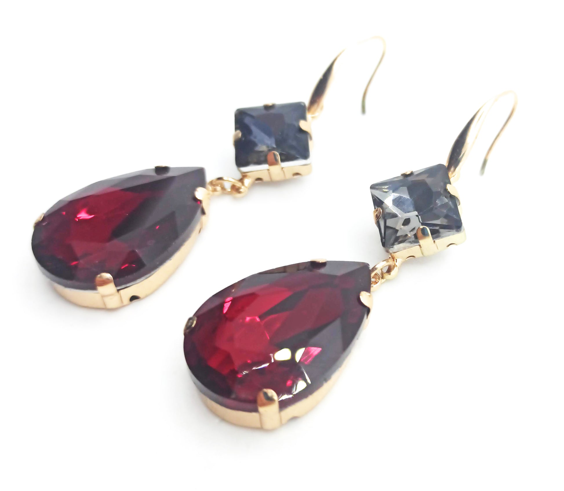 Pendientes Largos de Cristales de Colores XL · Lágrima Gris Rojo Rubí