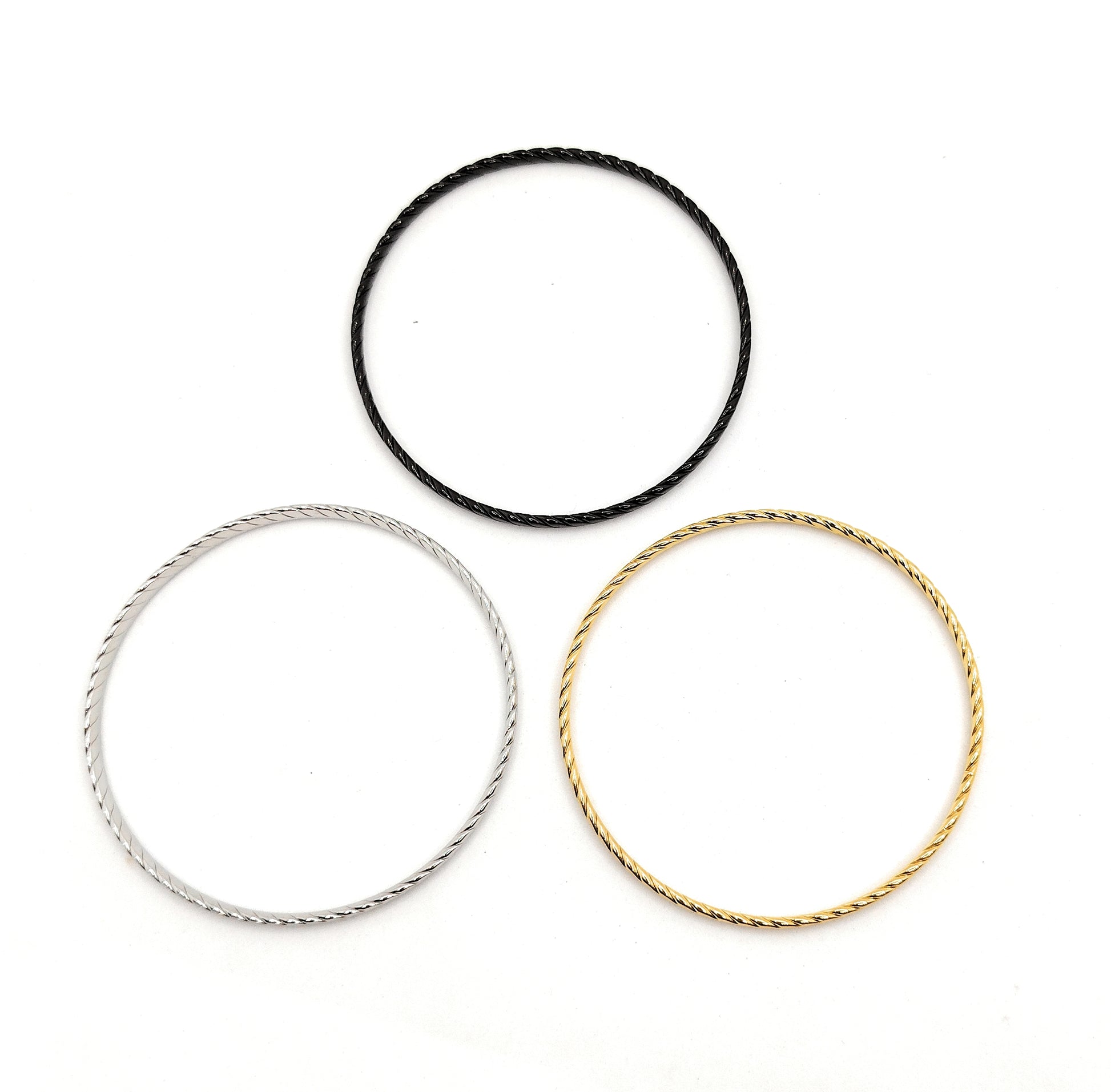 Set de tres pulseras rígidas y ligeras con acabado texturizado, diseñadas para combinar elegancia, brillo sutil y un estilo contemporáneo. Cada una luce un tono distinto - oro amarillo, plata y negro - , ideales para llevar juntas o por separado según la ocasión.